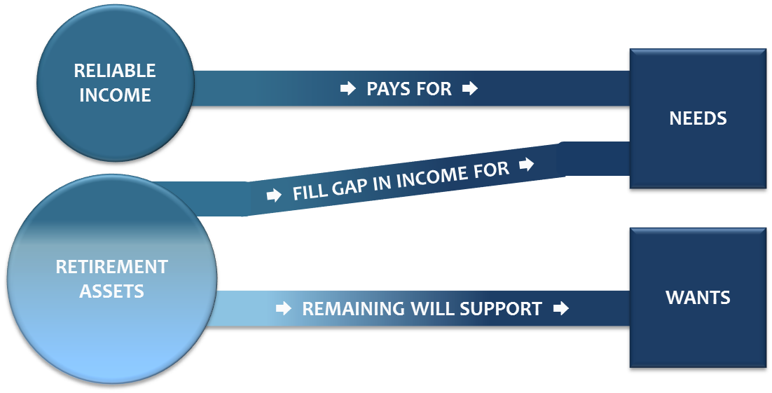 We combine four elements—reliable income, retirement assets, your needs, your wants—in order to provide a clearer understanding of your financial picture and the income sources that will be used to cover retirement expenses. “Needs,” during retirement, are defined as essential expenses you must meet and are based on your own values and priorities. Examples of needs include mortgage or rent payments, groceries, household utilities, etc. “ Wants” are expenses that are non-essential, but ideal in retirement. They reflect your vision of retirement. For example, traveling to visit family may be a necessity; while the additional expense of taking an annual trip to Europe might be a want.